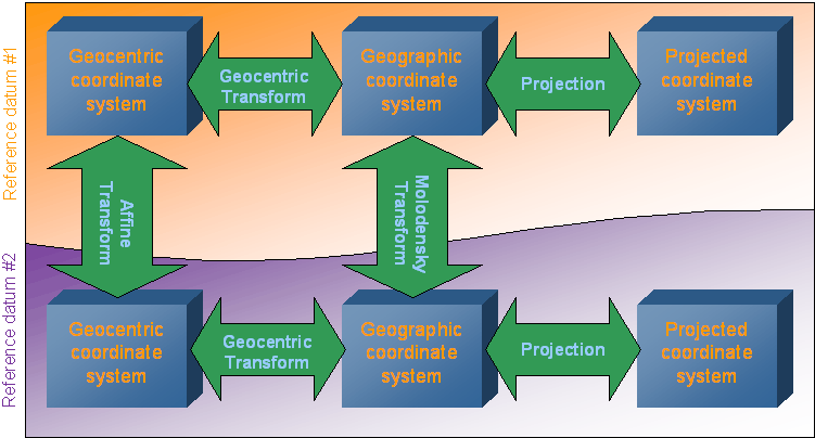Note that this path is not the only existing path. It is also possible to convert from geographic coordinates to geocentric coordinates, in which case the transformation path would be: