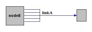 A hyperedge can have the same source node or the same target node multiple times. Say that a hyperedge, linkA, has the node, nodeB, five times as source node. (See the following figure.) By calling the methods shown in table Methods for retrieving links or hyperedges incident to a node, linkA would occur once only, even if it is incident to a node multiple times; that is, grapher.getHyperEdgesFrom(nodeB) would return linkA once only and grapher.getHyperEdgesFromCount(nodeB) would count linkA once only.