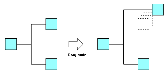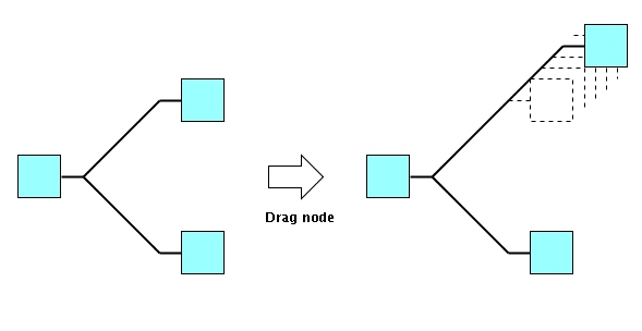 A segment with fixed angle always keeps this angle. When incident segments or end nodes are moved or dragged, a segment will become longer or shorter to stay visually connected, but it will not change its angle. This is shown in figures Orthogonal segments with fixed angle and Segments with fixed angle of 45 degrees.