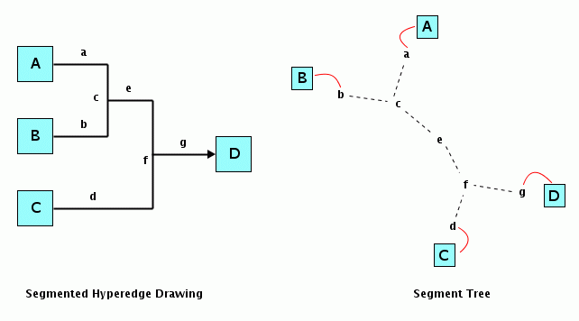 You may be surprised that the segment tree is undirected, even though the hyperedge may be directed. The direction of the hyperedge comes from the fact that arrow heads are drawn at certain end points. This direction is irrelevant for the segment tree; that is, there is no root of the segment tree, but each segment has several (or 0) incident segments. By starting at an arbitrary segment, an algorithm can traverse all incident segments recursively without running into a cycle. Therefore it is an unrooted, undirected segment tree.