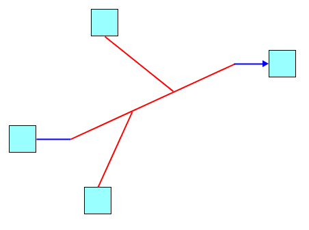 For many applications, the star-like shape is inappropriate, because applications prefer specific shapes, such as a shape consisting of orthogonal segments. To create such shapes, use the class IlvSegmentedHyperEdge, which is a subclass of IlvHyperEdge. The following figure shows examples of IlvHyperEdge (on the left) and IlvSegmentedHyperEdge (on the right).