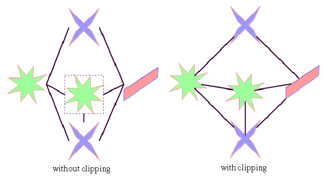 By default, TML does not place the connection points of links. It relies on the link connectors of the nodes to determine the connection points. If no link connectors are installed at the nodes, the default behavior is to connect to a point at the border of the bounding box of the nodes. If the node has a nonrectangular shape such as a triangle, rhombus, or circle, you may want the connection points to be placed exactly on the border of the shape. This can be achieved by specifying a link clip interface. The link clip interface allows you to correct the calculated connection point so that it lies on the border of the shape. The following figure shows an example.