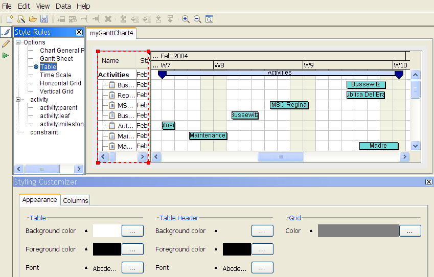 In this example, the columns Arrival and Demurrage in the Activities Table define additional attributes that do not correspond to any properties in the Gantt data model, however, the user-defined properties Arrival, and Demurragehave been automatically created and mapped to these columns.