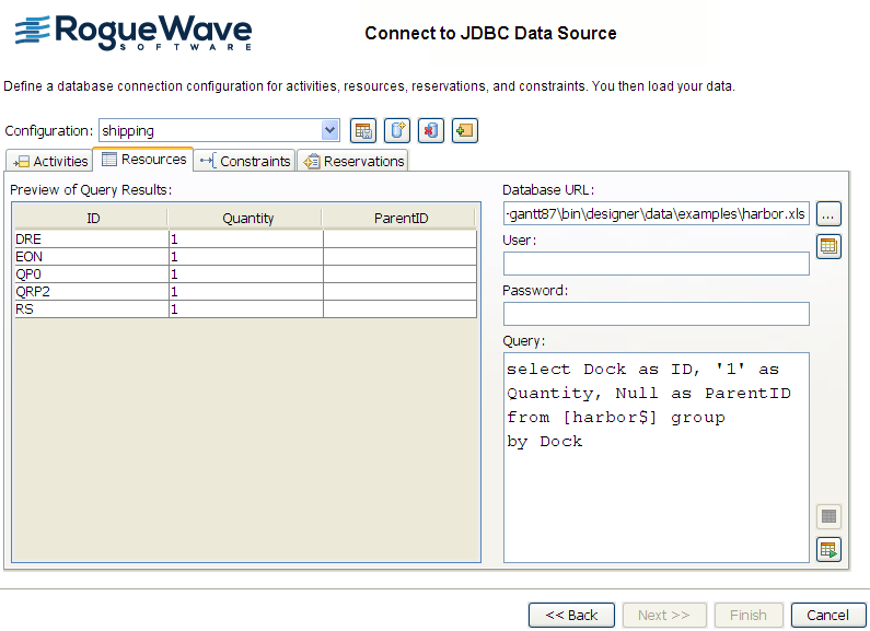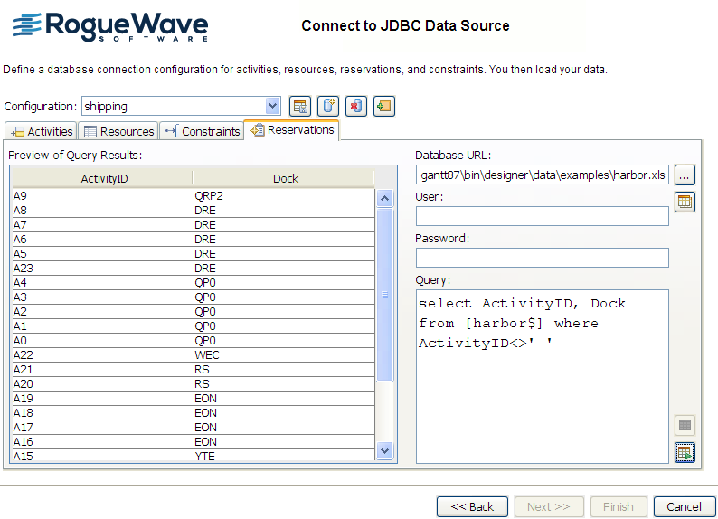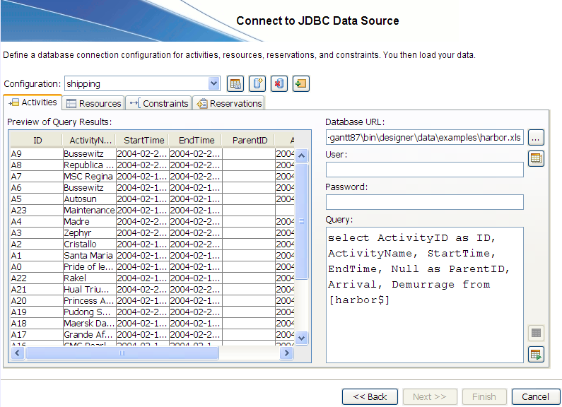 JViews Gantt lets you connect to a database to load data through JDBC. You can connect, for example, to a Microsoft® Access or an Oracle® database, or to a Microsoft® Excel or a Microsoft® Project file. The use case is based on data from the Microsoft® Excel file harbor.db. The data is the same as in harbor.csv (see the use case in Loading data from a flat file), but in this use case you will split the data into three tables with SQL queries.