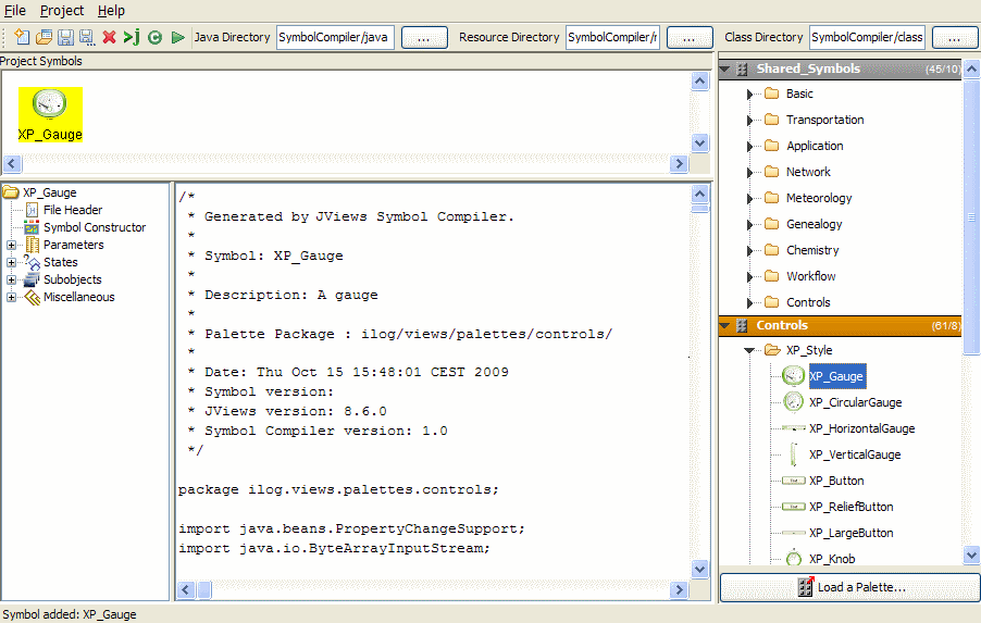 In some cases, it is interesting to select a slightly different approach which is to generate Java™ source code from the symbols you have created with the Symbol Editor. This Java code uses simple graphics primitives managed by the JViews Framework APIs. Each symbol becomes a JavaBean™ that you can instantiate and manage from your JViews application. Every single parameter you defined in the Symbol Editor becomes a bean property, accessible through traditional set/get methods. The tool that allows you to produce this Java code is the Symbol Compiler.