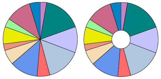 The following figure illustrates the representation modes available for a pie renderer: as a pie on the left, as a doughnut (with a hole size of 25) on the right.