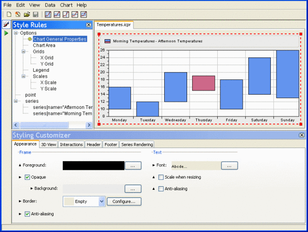 JViews Charts, a point-and-click editor for specifying most aspects of the display, including the data source and the "rules" for defining how the chart will appear on the screen under different data conditions;