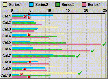 Data indicators that graphically represent the values of data points or a given data interval in the chart area. For example, you can decorate the chart by highlighting the week-end period using a data indicator which represents a data interval equal to the week-end period. The indicators are of the following type: