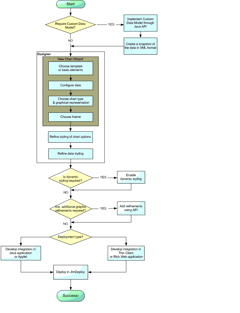 You can develop a chart from scratch or by connecting to existing data, with the Designer. Working with the Designer, you develop components entirely through the GUI of the Designer. However, you might need to write code to: