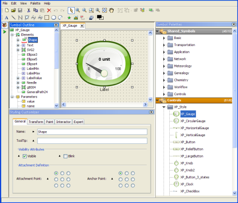 The Symbol Editor is a point-and-click interface used to create palettes of rich interactive symbols. These symbols combine graphic parts, custom behavior and interactions. They can be used to populate graphical views of your applications.
