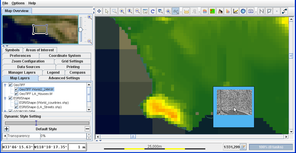 GeoTIFF format) files are grouped as sublayers under their parent layers. The last layer in the hierarchy becomes the front layer in the Map View pane. For example, the Labels layer is displayed in front of the GeoTIFF layer in the Map View pane.