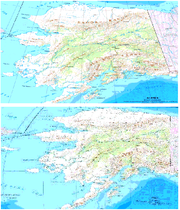 The first part of the following figure shows an initial map of Alaska. Calibration points have been placed around the right side of this image. The second part of the following figure shows the interpolated image, however, the left side is quite skewed.