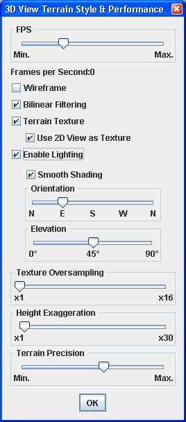Drag the slider to the position that corresponds to the value you want to set. You can choose between 3D View precision and CPU usage by increasing or decreasing this option. When set to minimum, very few 3D points are used to create the terrain mesh, so the terrain is less precise but the display is faster.