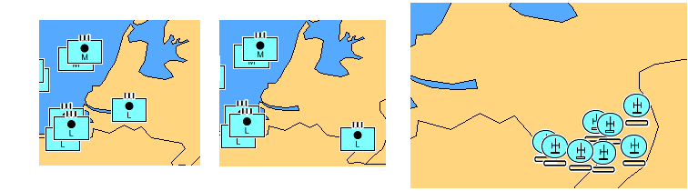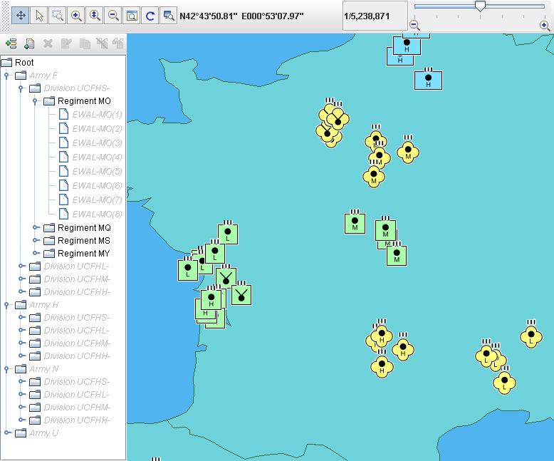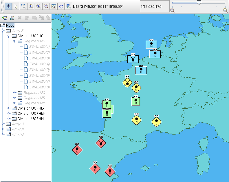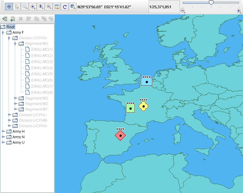 The following figure shows a map with a scale of 1/20 000 000 in which only the root level groups are visible: