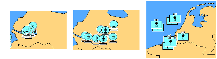 The following figure shows a map with a scale of 1/10 000 000 in which the level 1 groups are visible: