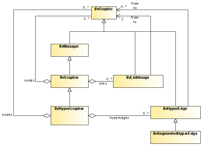 | A hypergraph that can contain nodes, links, and hyperedges. It is a subclass of IlvGrapher . Therefore, it can also contain normal links. An IlvHyperGrapher object is derived from IlvGrapher and from IlvManager, so it may sometimes be referred to as a grapher or a manager, depending on the context (functionality typical of IlvGrapher or IlvManager ). When the functionality under discussion is outside these contexts, the object is called a hypergraph. |