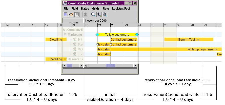 The Schedule chart is initially displayed with a visible duration of 4 days, from November 20 through November 23. The chart reservationCacheLoadThreshold is set to its default value of 0.25 and the reservationCacheLoadFactor is set to its default value of 1.5. When the chart is first displayed, it will query the data model for all reservations assigned to the visible resource rows and for which the reserved activity intersects the time interval of November 14 through November 29, a total of 16 days. The chart does this by invoking the method IlvGanttModel.reservationIterator (IlvResource resource, IlvTimeInterval interval). The time interval for which the chart queries the data model is computed as: