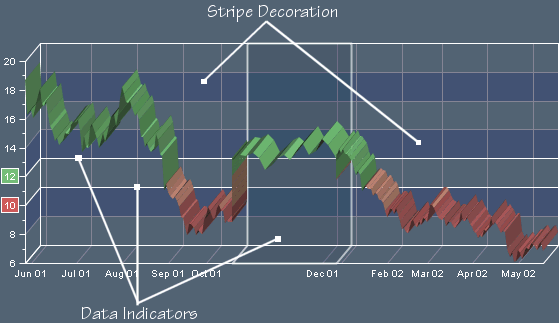 Decorations in 3-D shows a chart using the stripe decoration and data indicators.
