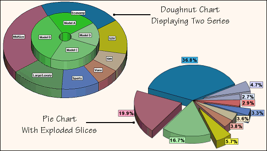 The JViews Charts library supports 3-D pie and doughnut charts. When several series are provided, each one is displayed in a separate layer. As in 2-D, you can also explode slices.