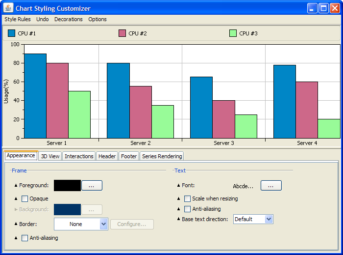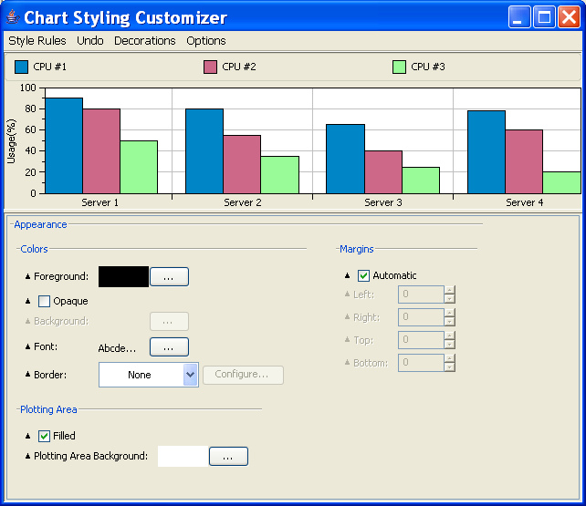 Rogue Wave® JViews Charts provides predefined chart customizers that can be customized and easily integrated into a JViews Charts application. These chart customizers are based on the CSS styling technology of the chart. Therefore, it is possible to create an application that: