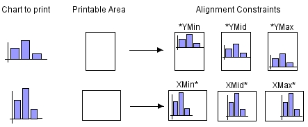 When the resize mode property is set to SCALE_TO_DIMENSION , the scalingAlignment property indicates the method to use when the aspect ratio of the chart does not match the aspect ratio of the printable area. The following figure shows the result for the different values depending on the destination printable area. The default value is XMID_YMID , that is, the chart is centered within the printable area.
