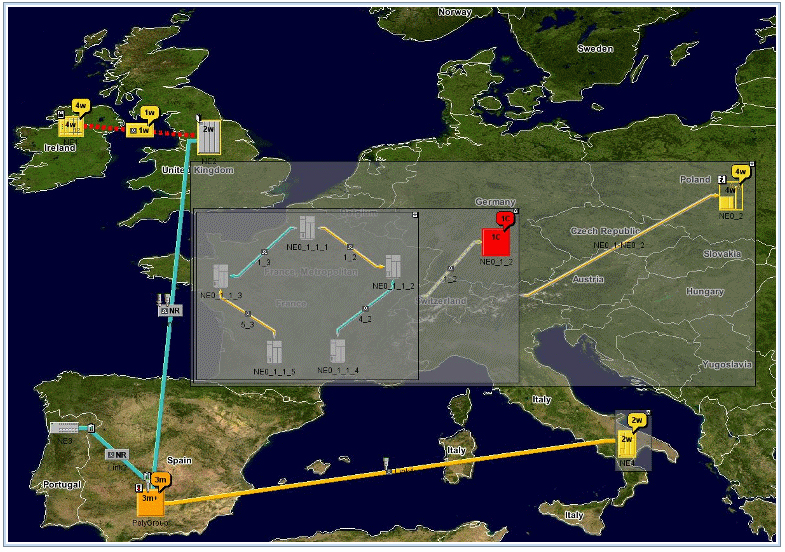 The network elements are georeferenced and displayed on digital maps. JViews Maps manages the type of map to be displayed and displays meaningful data at each zoom level. Overviews display high level networks (summaries) with continent or country maps underneath. Network operators can drill down into more detailed views: they zoom in on a specific region or even on a city, where they can see the network details. In these cases, JViews Maps loads more precise maps that are more convenient for city-level views.