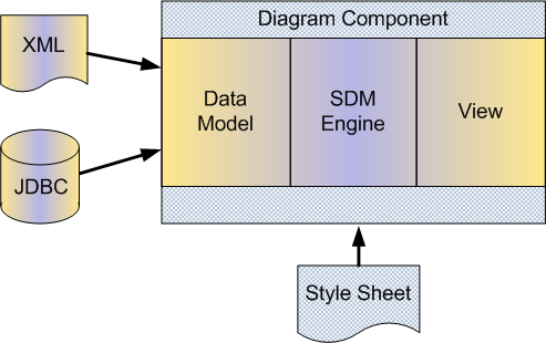 JViews Diagrammer is based on a model-view architecture that cleanly separates the data, the display, and the interaction facets of the component, see figure