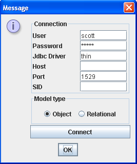 10. If you select the Export to Oracle option, a message window appears that enables you to connect to the database. Enter the connection parameters, click Connect and then click OK.