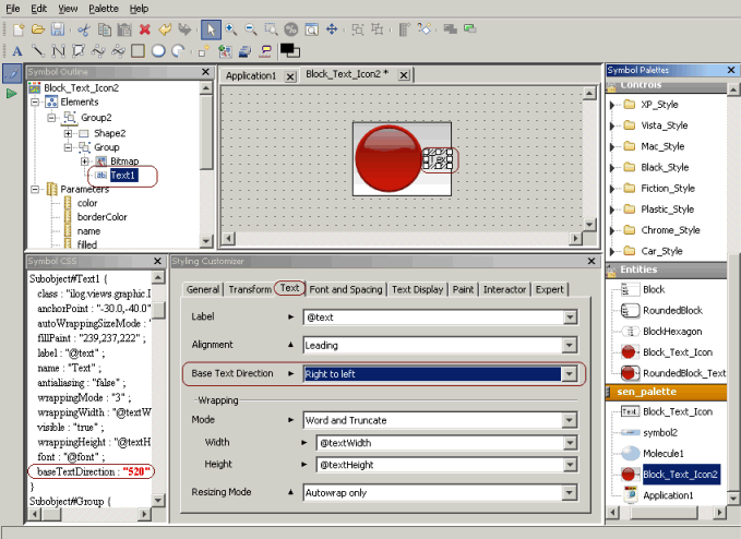 Base text direction applies only to the Text element of a symbol. The value of base text direction applies only to the Text element on which it is set. For more information about setting base text direction dynamically to have the same value for all text elements of a symbol object, and dynamically assigning one specific base text direction value to a specific text element of the symbol object, see