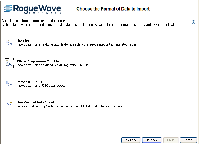 The New Diagram Wizard gives you a choice of the following formats of data to import: