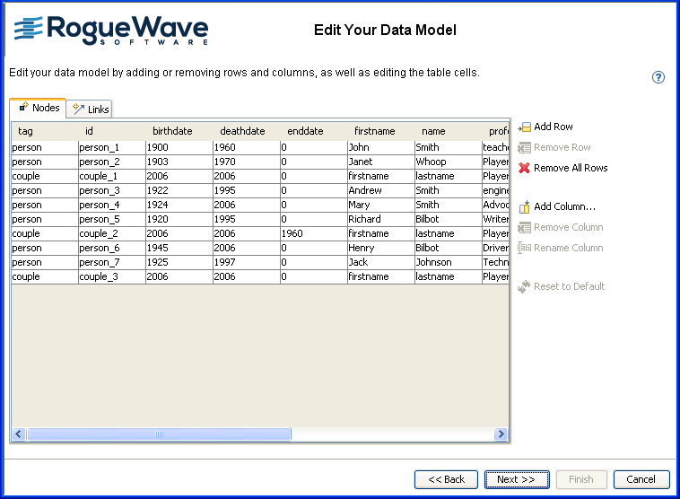 To clear all the data values, click Remove All Rows. To retrieve the values you saw initially, click Reset to Default.