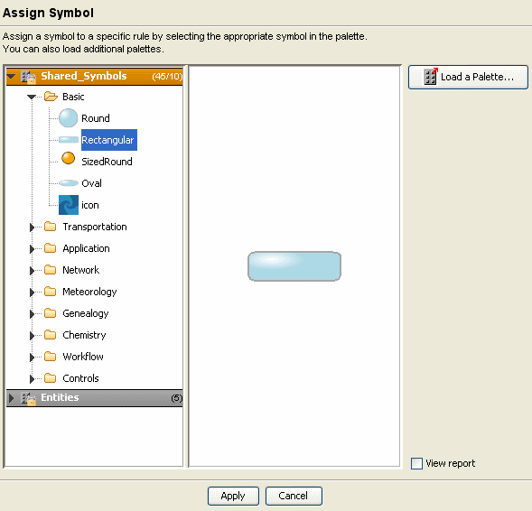 The jviews-palette-shared-symbols-9.0.jar palette is loaded by default. This palette is located in <installdir>/jviews-diagrammer/lib/palettes.