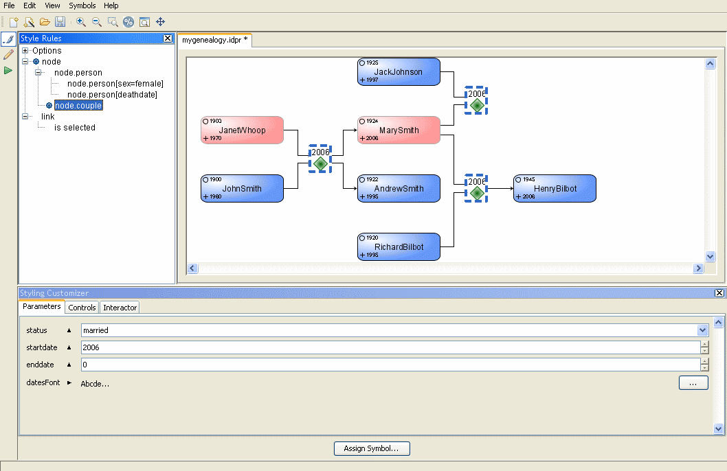 The symbol used in the diagram is quite basic. You will assign a different symbol to the person nodes to graphically represent more data, such as the birth date and the death date.