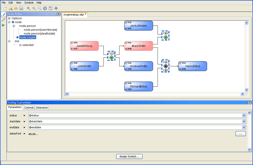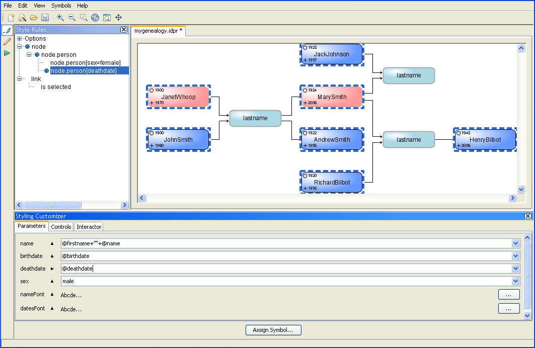 At this stage, the person nodes have a label showing the person’s name and birthdate. You will now add a death fact for the persons that are dead. This fact will not appear for living persons. Therefore you need to create a style rule to insert the death date only for dead persons.