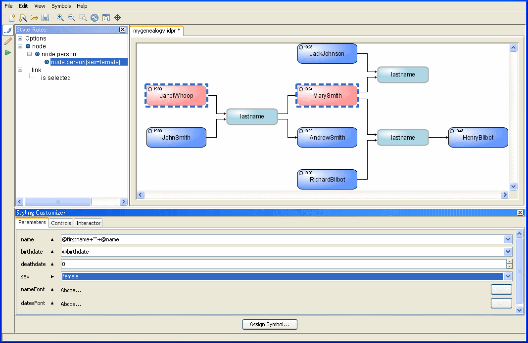 Setting properties in the Styling Customizer for person nodes