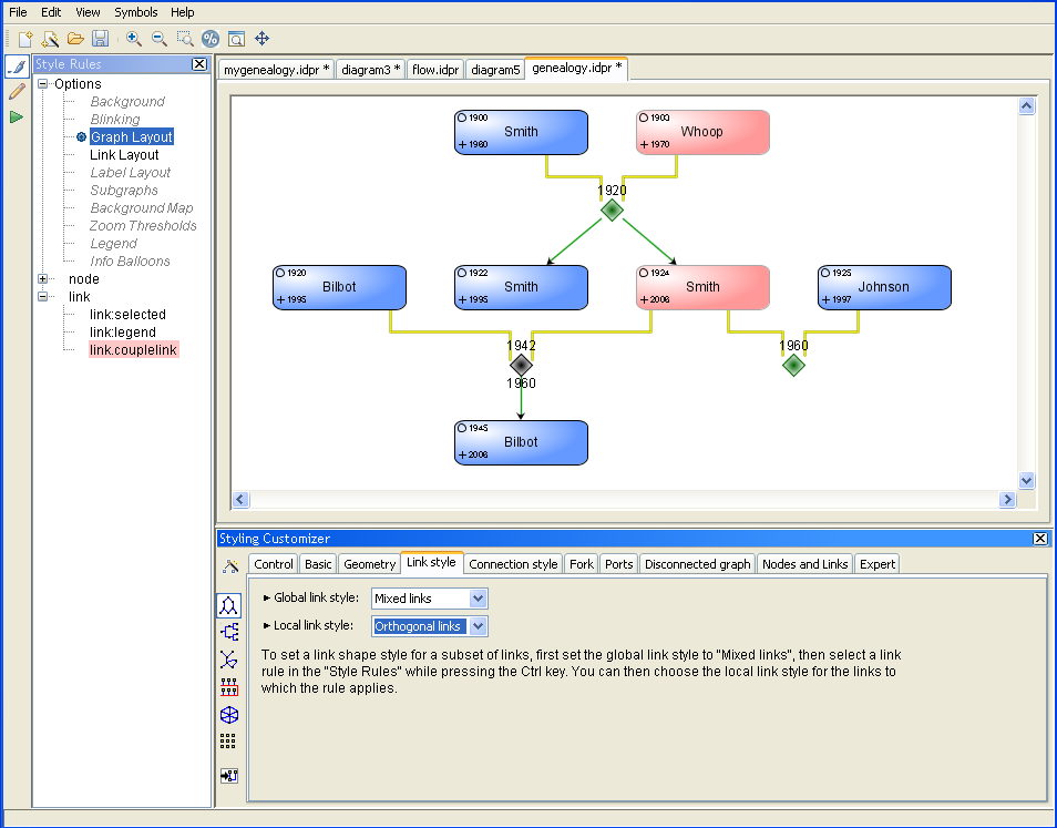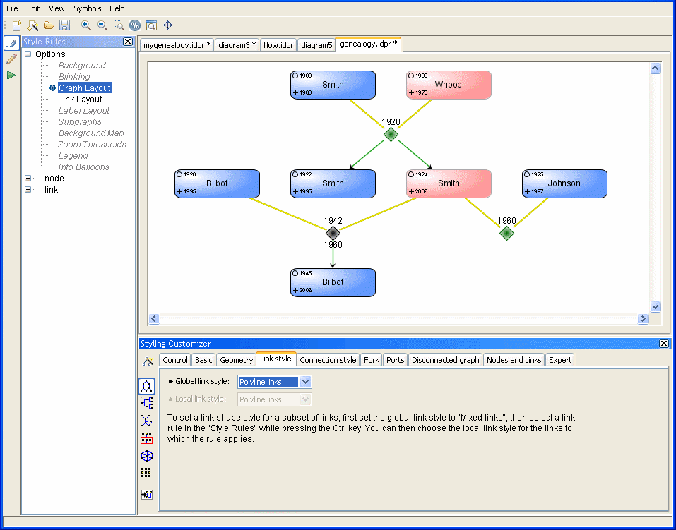 The Styling Customizer for the graph layout contains various layout parameters that apply to individual nodes and links or subsets of nodes and links.