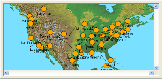 To see this diagram, load the XML data file supplied as <installdir>/jviews-diagrammer/bin/designer/data/examples/example.xml; the New Diagram Wizard sets the Map Diagram type by default because of the latitude and longitude values present in the data.