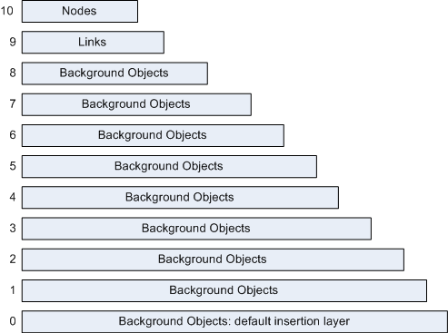A dashboard diagram allocates 11 layers for symbols and background objects. Symbols are stored in layer 10 (the node layer) and links are stored in layer 9. Layers 0 - 8 are available for background objects. The following figure shows the logical structure for layers in a dashboard diagram.