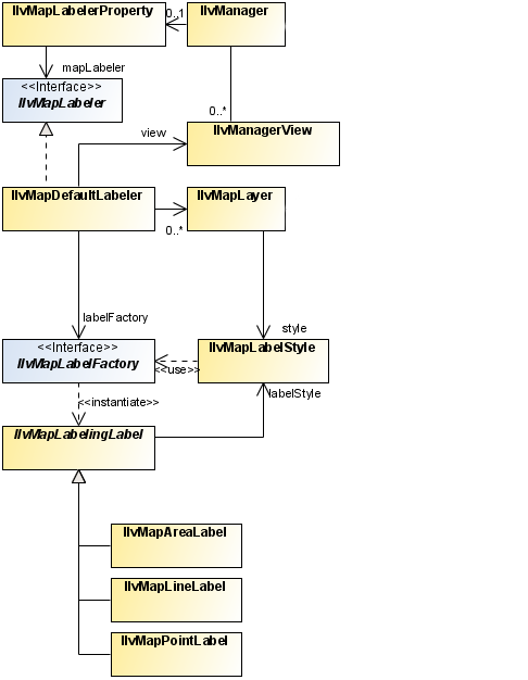 The IlvMapDefaultLabeler class holds references to labeled layers (the layers to be labeled) and label layers (the layers that display the labels). This class also holds a reference to an IlvMapLabelManager that acts as a controller for label rendering operations. The IlvMapLabelManager class monitors changes in the view (scrolling, zooming...), creates labels for all the visible graphic objects in the view that require labeling, and lays them out and draws them. This is all done in a separate thread so that user interaction is not blocked. Basically, this class contains the JViews Maps rendering engine.