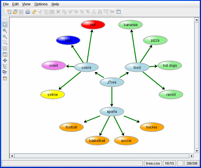 The Tree Model example displays the contents of a Swing JTree object as a graph. The nodes of the graph are the items in the tree (also called tree nodes), and the links of the graph represent the parent-child relationships between the items., see the following figure.