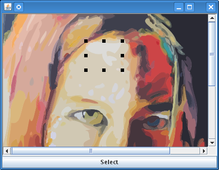In this step, you add interaction to the view by placing a selection interactor on it. To do this, add a Select button and associate it with the interactor. When you click the Select button, the selection interactor is placed on the view and you can select the graphic objects in the view (in this case, part of the person's face), move them around, and modify their shape.