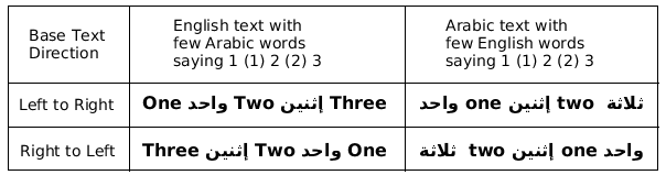 The objects in the upper row have the base text direction left to right and the objects in the lower row have the base text direction right to left. For an English user, the upper left text looks correct, since the majority of the text is English and an English user expects the reading direction left to right. For an Arabic user, the lower right text looks correct, since the majority of the text is Arabic and an Arabic user expects the reading direction right to left.
