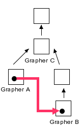 Given that an intergraph link has an origin and a destination in different graphers, the question that arises is in which grapher the link is stored. The intergraph link between a node stored in grapher A and a node stored in grapher B must be stored in the first common ancestor of A and B, as shown in the following figure.
