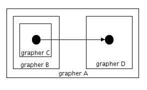 Grapher A contains two graphers, B and D. Grapher B contains another grapher, C. The intergraph link from an object of C to an object of D is then stored in A.