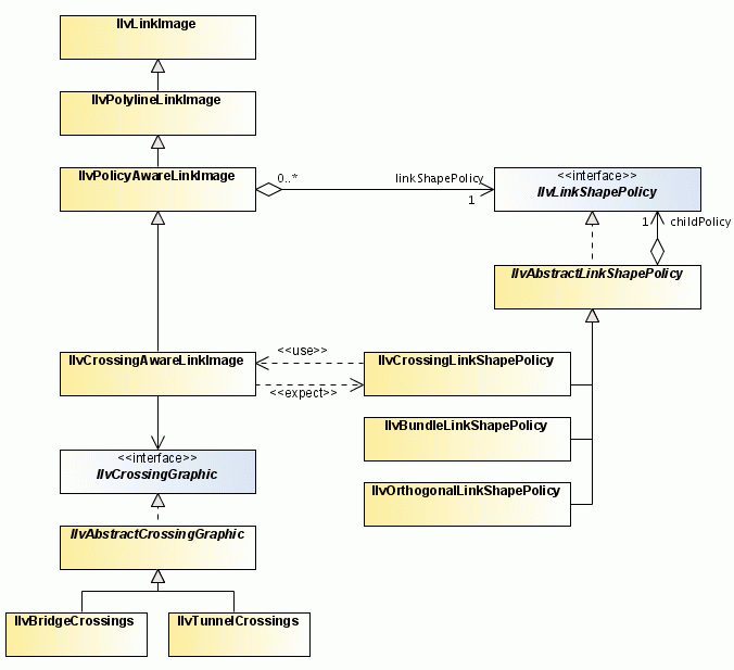 Subclasses of IlvPolicyAwareLinkImage can have link shape policies. Normally, link shape policies can be shared by different links. Subclasses of IlvAbstractLinkShapePolicy allow you to link the policies using the child policy handle. This allows you to install multiple policies on a link. The IlvCrossingLinkShapePolicy calculates the crossing points of an IlvCrossingAwareLinkImage . The crossings are drawn using a crossing graphic; that is, an IlvGraphic that additionally implements the IlvCrossingGraphic interface.