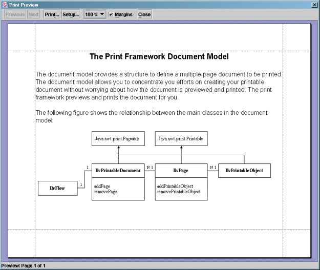 The document model provides a structure for defining a multipage document to be printed. The document model allows you to concentrate your efforts on creating your printable document without worrying about how the document is previewed and printed. The printing framework previews and prints the document for you.