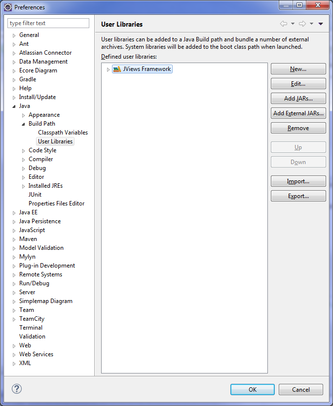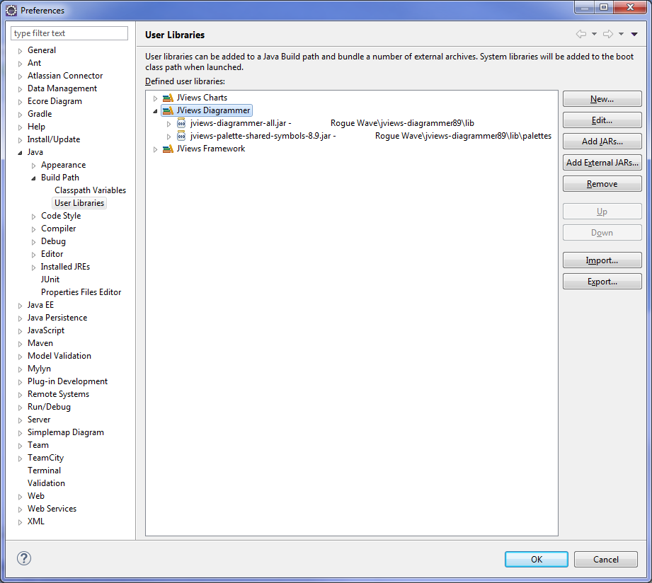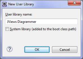 4. Click New and enter a user library name of your choice, for example, JViews Diagrammer and then click OK.