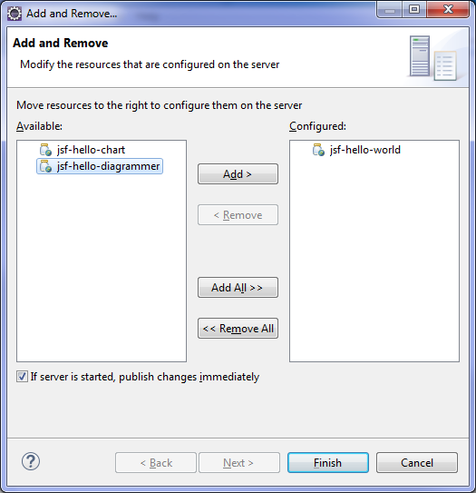4. Make sure that you can see both jsf-hello-worldand jsf-hello-diagrammer in the right pane and click Finish.