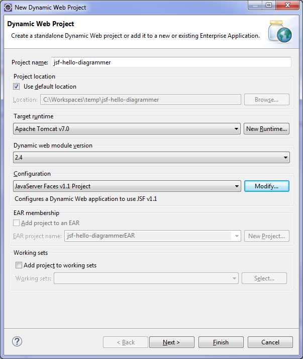 2. Enter jsf-hello-diagrammer as the Project name and select JavaServer Faces v1.1 Project as the Configuration.
