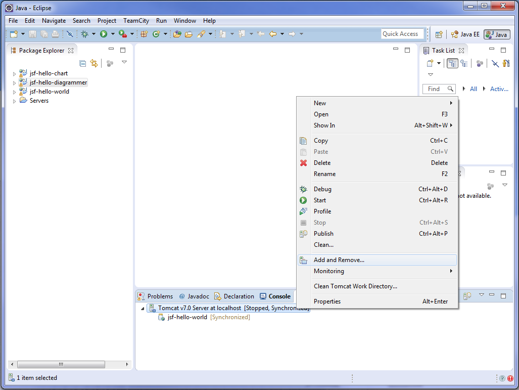 1. In the Server tab, right-click Tomcat v7.0 Server at localhost and select Add and Remove…: